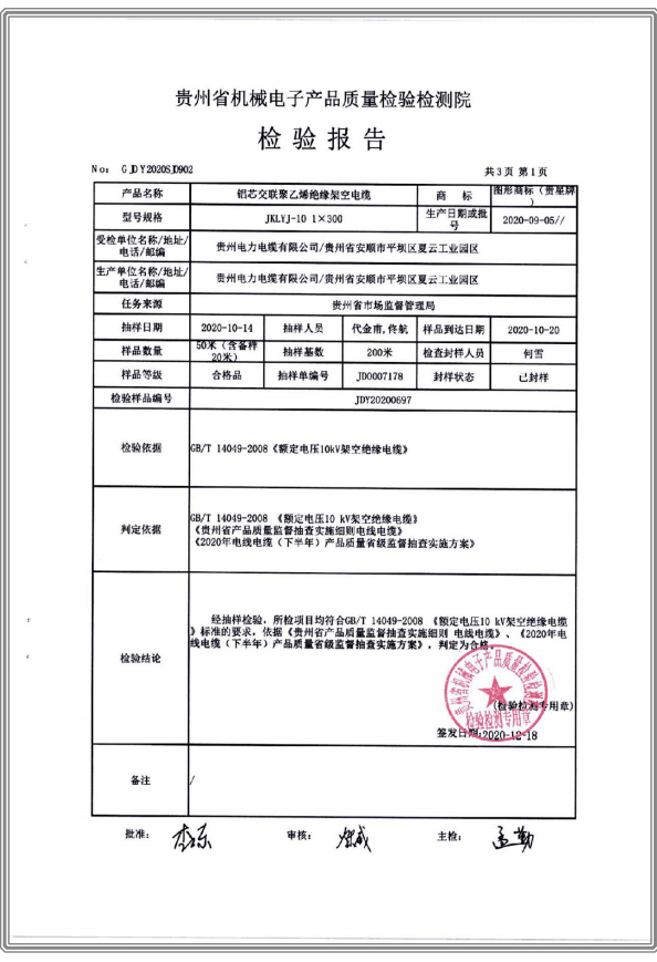 鋁芯交聯(lián)聚乙烯絕緣架空電纜 檢驗報告